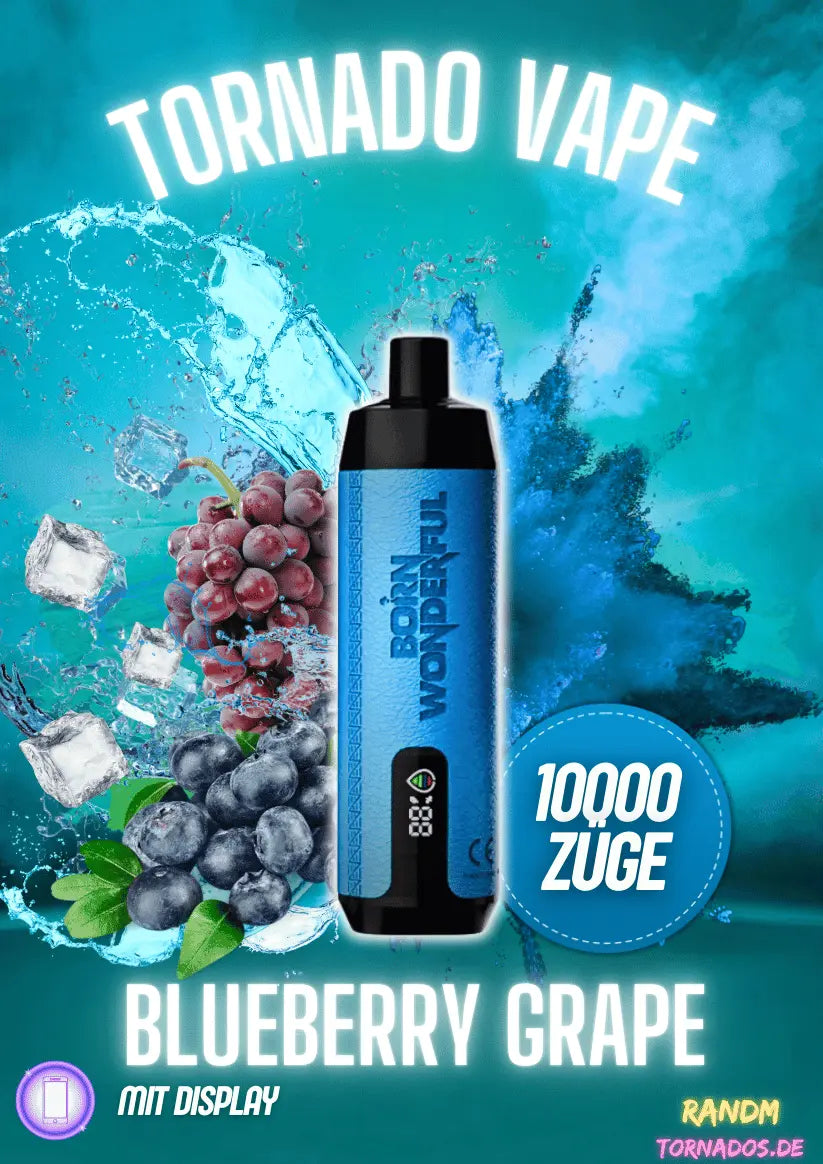 Jeder Atemzug der RandM Tornado 10000 “Blueberry Grape” taucht dich in ein Meer von reifen Beeren. das durch die aromatische Tiefe der Traube verollstndigt wird. Es ist wie ein Spaziergang durch ein sonnenverwhntes Fruchtfeld. jederzeit und ??berall.
