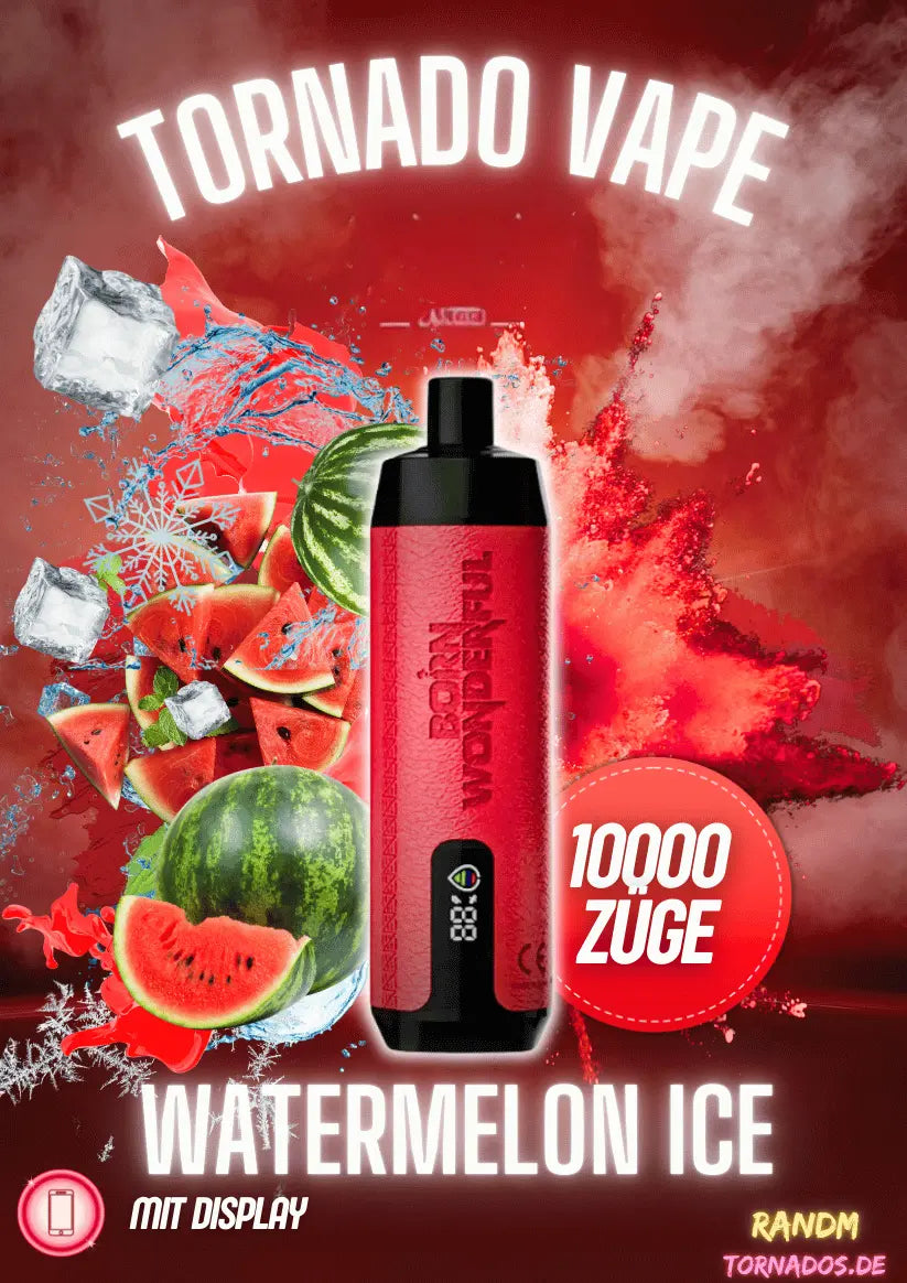 Erlebe den erfrischenden Geschmack von saftiger Wassermelone. verfeinert mit einer k??hlen Eisnote. Die Randm Tornado 10000 Watermelon Ice Vape bringt dir ein intensives und erfrischendes Dampferlebnis. das deine Sinne belebt und dir bei jedem Zug eine kstliche Abk??hlung bietet.